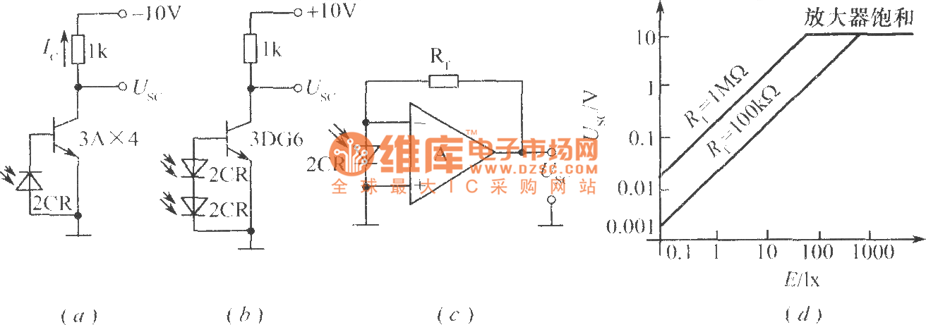 The figures (a), (b) are the light current amplification circuit which work in the linear region. The transistor in figure (a) must be germanium tube. Because the maximum open circuit voltage of photocell is only 0.6V, while the silicone tube turn on need 0.7V. When the output voltage produced by light is more than 0.3V, transistor 3AX4 starts to conduct, output voltage Usc begins to decrease from -10V. Due to the resistance of 3AX4 is lower, so it can obtain good linear output. The figure (b) adopts two photocells in series, transistor uses silicon tube. The circuit in figure (c) is connected with operational amplifier, the equivalent load resistance is zero, so the output voltage of operational amplifier is equal to the product of silicon photocell short-circuit current Isc and amplifier feedback resistor Rf, that is USc = IscRf, and the output has good linearity, as shown in (d).