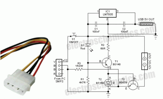 This little circuit will help you to remove all surplus small ac mains adaptors from your desktop. The circuit is nothing, but a smart dc power box directly powered by the smps of your desktop personal computer. Regulated, clean and protected +12VDC is available at the output of this unit. In addition, a USB power port is provided to re-charge portable devices including cellphones and music players, etc.How does the pc power box worksAll you need is to open your system box and connect an unused 4-pin drive power connector from the system smps to this circuit. +12V (Yellow wire) from the smps is processed by a resettable electronic fuse built around components T1, T2 and T3 and feed to the output terminal. Similarly the +12V is down converted to stable +5V by fixed 3 pin regulator IC1.As a result, +12V (500 -750mA max, based on the electrical characteristics of T2 used) and +5V (1A max) DC supplies are available for external use, without affecting the normal pc functions. Switch S1 is the power on/off cum reset switch. Resistor R3 sets the maximum allowable output current rate and T1 disables the output power switch T3, when output load current exceeds the set value.