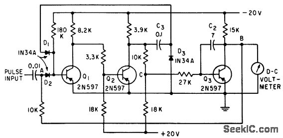Auxiliary flip-flop compares input pulse with voltage already on integrating capacitor. Flip-flop then automatically adjusts capacitor charge to match peak voltage of input. Q2 is integrcaor, controlled by flip-flop Q1-Q2.-R. P. MacKenzie, Novel Design Peak Voltmeter, Electronics, 33:25, p 57.