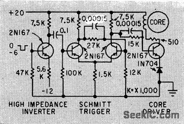 In addition to phase reversal of input signal, single npn transistor provides isolation between negative input pulse and core driver, which is Schmitt trigger having discrimimation level within 10% of -4.5 v including phase inverters. Signals below that level are disregarded. Signal range from 6 to 12 v will cause pulse output from Schmitt, with duration dependent on duration of input signal. When Schmitt trigger emits pulse, 1N704 driver supplies 30-ma current pulse, writing a ONE into ifs associated core.-R. Wasserman und W. Nutting, Solid-Stale Digital Code-to-Code Converter, Electronics,32:50, p 60-63.