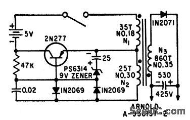 Flybcck or ringing choke oscillator is free-running when voltage on regulator capacitor C2 is less than zener voltage for reference diode D2, but converter action is halted when desired output voltage is reached. Circuit then periodically replaces charge lost by capacitor leakage.Energy conversion efficiency can therefore exceed 50% theoretical upper limit of most conventional photoflash circuits.-R. J. Sherin, Efficient Photoflash Power Converter, Electronics, 33:4, p 57.