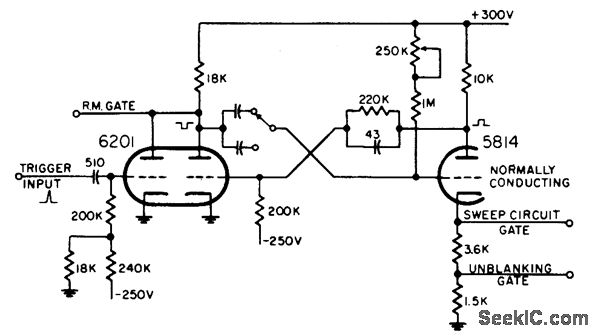 Used in combination search and gun-laying radar. Triggered by connecting plate of trigger inverter or switch tube in parallel with plate of normally-off mvbr tube. Provides positive unblanking gate for crt. Different gate lengths are obtained by switching mvbr capacitors.-NBS, Handbook Preferred Circuits Navy Aeronautical Electronic Equipment, Vol. 1, Electron Tube Circuits, 1963, p N10-2.