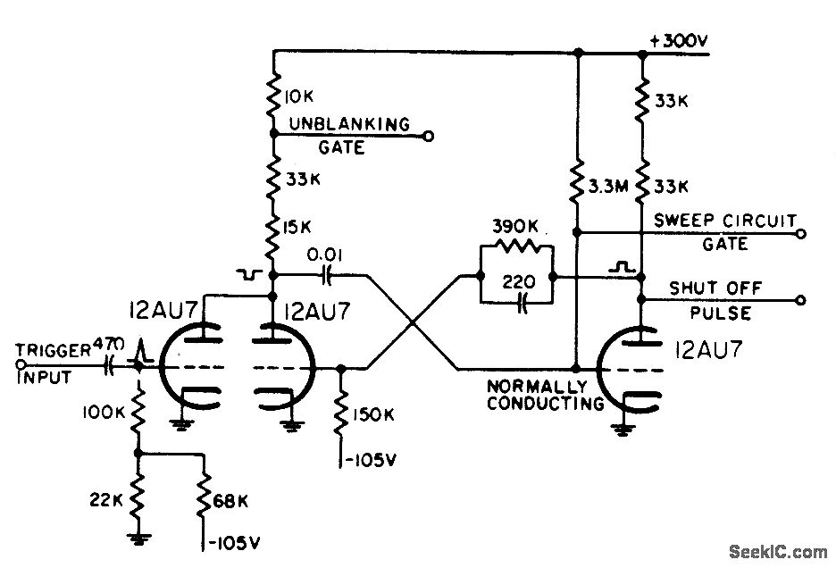 Triggered by connecting plate of trigger inverter or switch tube in parallel with plate of normally-off mvbr tube. Unblanking gate is generated at mvbr as negative output. Used in radar to provide pate during which display sweep is generated, together with gates for generating waveforms that must be coincident with display sweep.-NBS, Handbook Preferred Circuits Navy Aeronautical Electronic Equipment, Vol. 1, Electron Tube Circuits, 1963, p N10-2.