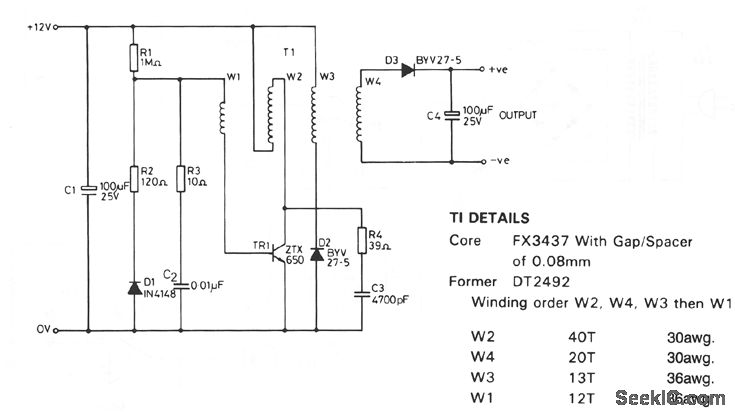 With the transistor on, a magnetizing current builds up in W2, which eventually saturates the ferrite core of transformer T1. This results in a sudden increase on the collector current flowing through TR1, causing its collector-emitter voltage to rise, and thus reducing the voltage across W2. The current flowing in W2 forces the collector voltage of the TR1 to swing positive until restricted by transformer output load-ing. Rc network R4 and C3 limits the turn off transient TR1. R3 and C2 maintain the loop gain of the circuit when diode D1 is not conducting.