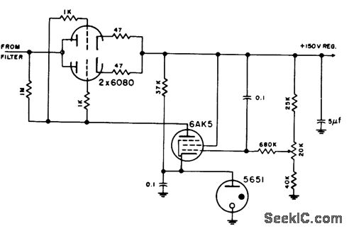 Has self-contained 150-v positive reference potential for pentode regulator, but gives only marginal operation.-NBS, Handbook Preferred Circuits Navy Aeronautical Electronic Equipment, Vol. 1, Electron Tube Circuits, 1963, p N2-4.