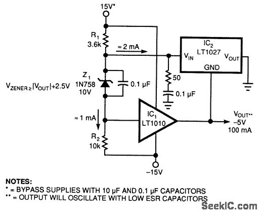 A method of boosting the output current of a reference and also protecting against overloads is shown in Fig. 66-5. IC1 acts as a power buffer. The LT1027 forces the output of VOUT and ground to be 5 V. The RC damper (50Ω and 0.1 μF) provides loop stability. The output might oscillate if low ESR capacitors are connected to it, so use aluminum electrolytic or tantalum capacitors instead of ceramic or mylar.