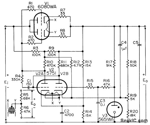 Provides either polarity of output with 1% regulation, from minimum of 350 v d-c input. Maximum output current is 125 ma for single series tube section and 100 ma per triode section when two or morn are paralleled. Minimum value of C5 is 4 mfd.-NBS, Hand-book Preferred Circuits Navy Aeronautical Electronic Equipment, Vol. 1, Electron Tube Circuits, 1963, PC 3, p 3-2.