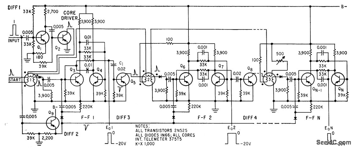 Receives train of varying width pulses and presents each pulse at output terminal corresponding lo position of pulse in train, without changing pulse widths. Three transistors and one ferrite core are used for each sorted pulse. Can handle over 1,000 pps.-J. H. Porter, Pulse Sorting with Transistors and Ferrites, Electronics, 32:20, p 64-65.