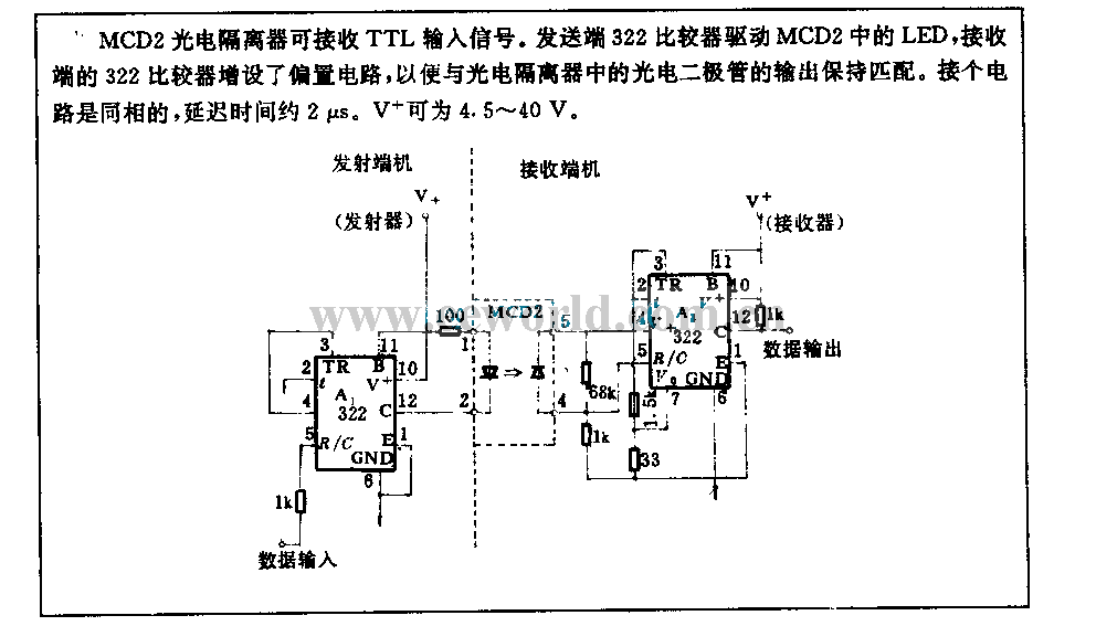 MCD2 photoelectric isolator can receive TTL input singal. Transmitter 322 comparator drives LED of MCD2, receiver 322 comparator is added bias circuit, then it can match with the photodiode output of photoelectric isolator. This circuit is inphase, the delay time is about 2μs. V+ can be 4.5~40V.