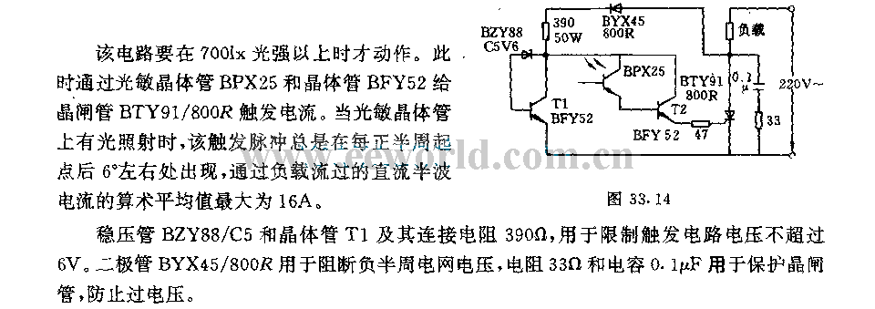 When the light intensity is more than 700lx, this circuit will take action. The light-sensitive transistor BPX25 and transistor BFY52 provide SCR BTY91/800R with trigger current. When the light-sensitive transistor has light, this trigger pulse always appears about 6°behind each positive half cycle starting point, the maximum arithmetic mean value of DC half wave current flows load is 16A.