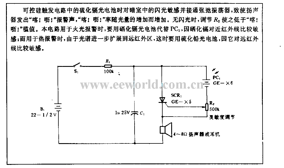 The cadmium sulfide photocell of thyristor trigger circuit is sensitive to the flashing in dark room and it is connected to relaxation oscillator, it leads to the loudspeaker souds out alarm, its alarm frequency increases with the increasing of the light density. When it is no flashing, R2 will be lower than the threshold value after adjusting. When this circuit is used for firelight alarming, it should use cadmium selenide to replace PC1, because cadmium selenide is sensitive to near infrared ray; when this circuit is use to heat alarm, because the spectrum is further expanded to far infrared band, so it should use pbs photocell due to it is sensitive to far infrared ray.