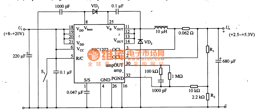 Figure 22 is a DC converter circuit constituted by the BIC1222. BIC1222 has two synchronous rectifier power MOSFET, the control circuit, over-current protection circuit and thermal protection circuit module. It has on and off function. The circuit's input voltage is +8 ~ +20 V, output voltage is + 2.5 ~ +5.3 V, output current is 5A. The output voltage is setted by external resistors R1 and R2 in the range of +2.5 ~ +12 V. Output voltage U. = [2.45V (R1 +2 R)] / R2. In the circuit, R2 = 2.2KΩ, U. = 2.5V, R1 = 47Ω; U. 3.3V, R1 = 770Ω; U. 5.0V, R1 = 2.3KΩ.