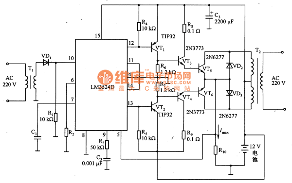 LM3524D is a kind of switch power supply controller which uses PWM operate mode. In the working mode, the pin 12 and pin 13 of LM3524D output pulse signals with the phase difference of 180°, whose voltages are amplified through VT1 and VT2 and then the electric currents are stimulated to be amplified by VT3 and VT4. As a result, both of the two processes drive the VT5 and VT6 to amplify the power of the pulse signals. The power amplifier VT5 and VT6 generates 12V square AV voltages on the one side of T2 transformer according to the alternating of the pulse signals outputting by VT1 and VT2.between turning on and turning off. After being stepped up, the square AV voltages are changed to 220 V AV voltages and are output through the other side of the transformer T2, which offer power supply for the load. The operating frequency of this circuit is decided by R2 and C1.VD2 and VD3 in this circuit is used to prevent the power amplifier from flowing through the current with a opposite direction.