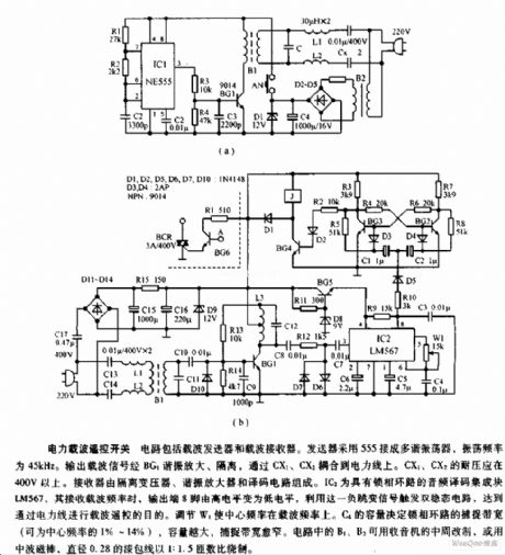 This circuit is composed of carrier transmitter and carrier receiver. The transmitter uses a 555 and is jionted to be a multi-vibrator, whose oscillation frequency is 45kHz. Output carrier signal is amplified and isolated by BG1 resonance and then it is coupled to the power line. The receiver is composed of a isolation transformer, a resonance amplifier and a decoding circuit.
