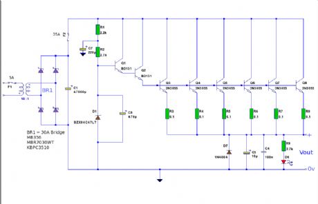 In this circuit a zener diode is amplified by a set of power transistors. The transistors substantially increase the current and power to the load.