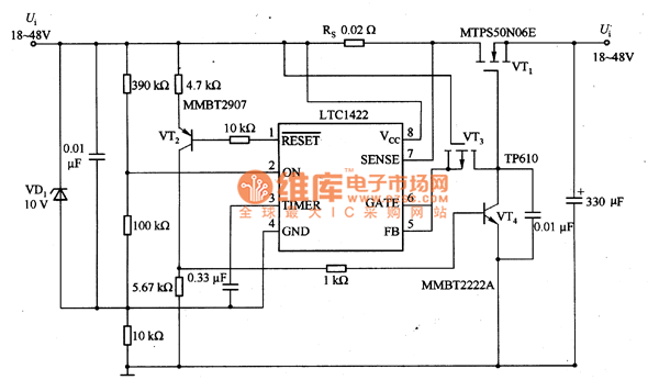 The power supply circuit of LTC1422 is as above.When the input voltage is connected,regulated diode VD1 controls the voltage of LTC1422 Vcc(8 feet) and Gnd(feet 4) and the voltage is 10V.GATE(feet 6)begins to output low PWL and it is connected to MOSFET(VT3) source.the gate of VT3 is connected to voltage Ui and the potential is higher than source,thus it can not be stopped.When the voltage on FB(feet 5) is lower than 1.232V.SET(comparator output end) pin turns into low PWL,VT2 and VT4 conducts,which makes the VT1 gate reach the ground.