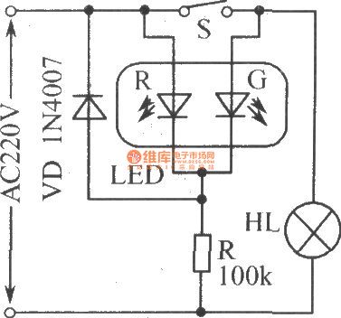As shown in the figure, LED - R is used for power source directions, LED-G is used for working condition indicator of the load HL ( lamp ). When 220V AC mains is normal, LED - R emits red light. When switch S is closed, HL also emitting light, LED-G emits green light, because the LED-R also emits light at this time, bicolor LED emits orange-red light when S is closed.