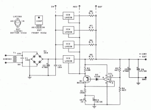 This is a regulated and adjustable power supply which can deliver up to 20A and adjustable voltage between 4 and 30V. It is easy to build and uses LM338 and 741 integrated circuits. VR1 it is used to adjust the output voltage.