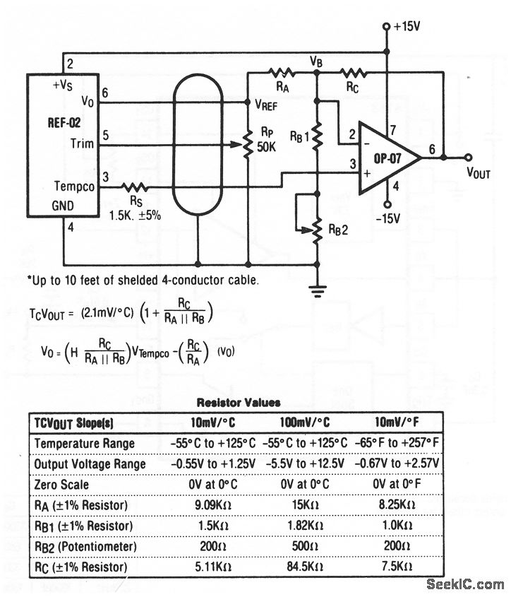 selected from table in Fig. 12-8. Then, turn off the power, short pin 6 (VO) of REF-02 to ground, apply exactly 100.00 mV to the op-amp output (pin 6 of OP-07), and adjust RB2 so that VB= X. Now, remove the short and the 100-mV source, reapply circuit power, and adjust RP so that the op-amp output voltage equals (TA) (,S). The system is now calibrated. For remote sensor applications, a 1.5-kΩ resistor (RS) must be connected in series with pin 6 of REF-02. This isolates REF-02 from cable capacitances. Use low temperature coefficient metal-film resistors for RA, RB, and RC Raytheon Linear integrated Circuits, 1989 p. 8-16