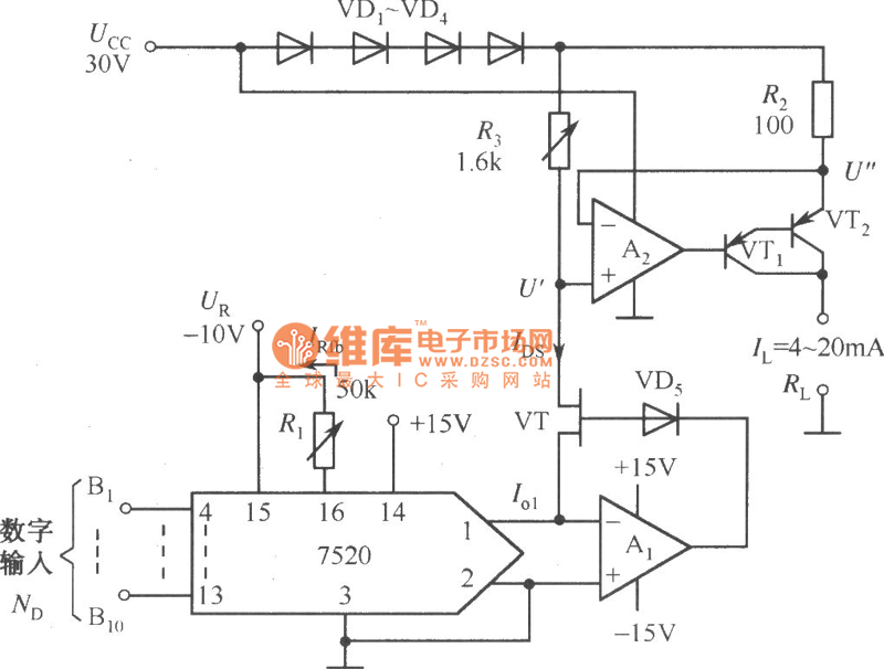 Program-controlled current source(7520DAC) circuit diagramis shown as below.