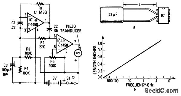 A simple detector of radar signals uses the junctions of the input transistors of an LM1458 op amp as RF detectors. The leads of C1 act as an antenna and should be about 0.4 long measured from the IC package. Detected audio components are further amplified by IC1A and IC1B, and drive a piezo transducer. Mount the circuit so that incident RF energy will not be blocked.