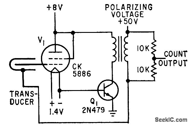 Permils measuring extremely low pressures in laboratory equipment and in high-althude research. Provides digital output that can be used for storage for telemetry. Transformer is audio type with Iarge step-up ratio. Polarizing voltage supplies less than 1 microamp. Transducer is small cylindrical tube lined with radioactive foil.-G. F. Vanderschmidt, Using lsotopes to Measure tow Pressures, Electron-ics, 32:25, p 60-61.