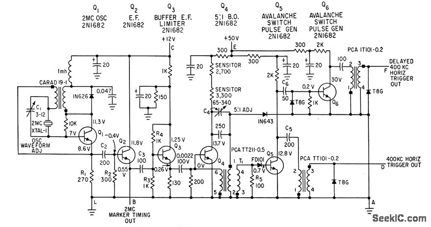Crystal oscillator (2 Mc) triggers blocking oscillator Q4 that counts down by 5 to produce 400-kc timing pulses for test oscilloscope using tv-type scanning.-R. P. Rufer and W. A Karotski, Use Raster Oscilloscopes for Easter Time Measurement,Electronics,35:52,p 38-42.