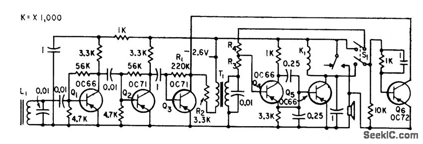 Fertile antenna L1 is tuned to one of up to 45 different carrier frequencies in range from 15 to 30 kc, keyed at various repetition rates. Resonant relay K1 in collector circuit of detector Q5 vibrates when excited at its natural keying rate, thereby interrupting loudspeaker current at audio rate to create paging tone.-J. G. DeGraaf, Selective Paging System Uses Coded Transmission, Electronics, 33:9, p 68-70.