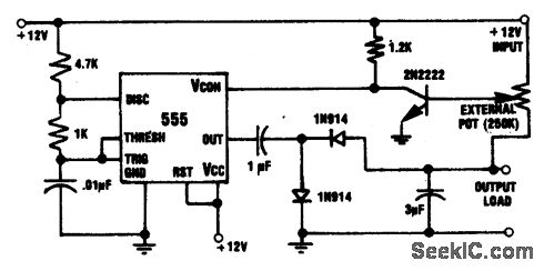 This circuit combines a 555 timer with a 2N2222 transistor and an extemal potentiometer. The pot adjusts the output voltage to the desired value. To regulate the output voltage, the 2N2222 varies the control voltage of the 555 IC, increasing or decreasing the pulse repetition rate. A 1.2 K resistor is used as a collector load. The transistor base is driven from the extemal pot. If the output voltage becomes less negative, the control voltage moves closer to ground, causing the repetition rate of the 555 to increase, which, in turn, causes the 3 μF capacitor to charge more frequently. Output voltage for the circuit is 0 to 10 V, adjusted by the extemal pot. Output regulation is less than five percent for 0 to 10 mA and less than .05 percent for 0 to 0.2 mA.