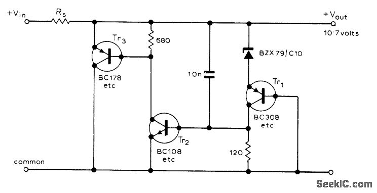 Shunt regulator re-moves virtually all AC line ripple without using large capacitor, making it ideal for audio applications where freedom from ripple is more important than precise supply voltage level. Circuit cannot be damaged by short-circuits. Tr3 may be power transistor or Darlington.-P. S. Bright, Ripple Eliminator, Wireless World, April 1977, p 62.