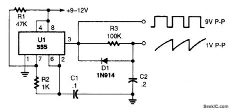 A sawtooth waveform generator circuit using a 555 IC is shown. The IC is connected in an astable oscillator circuit with the majority of the output contained in the positive portion of the cy-cle. The negative output is a very brief pulse.Capacitor C2 charges through R3 in a positive direction during the time that the IC's output (at pin 3) is high. When the output goes negative, C2 is rapidly discharged through Dl and the IC's out-put.Peak-to-peak sawtooth output is about 1 V. The linearity of this circuit is best when R3 is as large as possible. The oscillator's frequency is about 200 Hz and can be increased by lowering either the value of R1 or C1 to decrease the frequency, increase the values of those components.