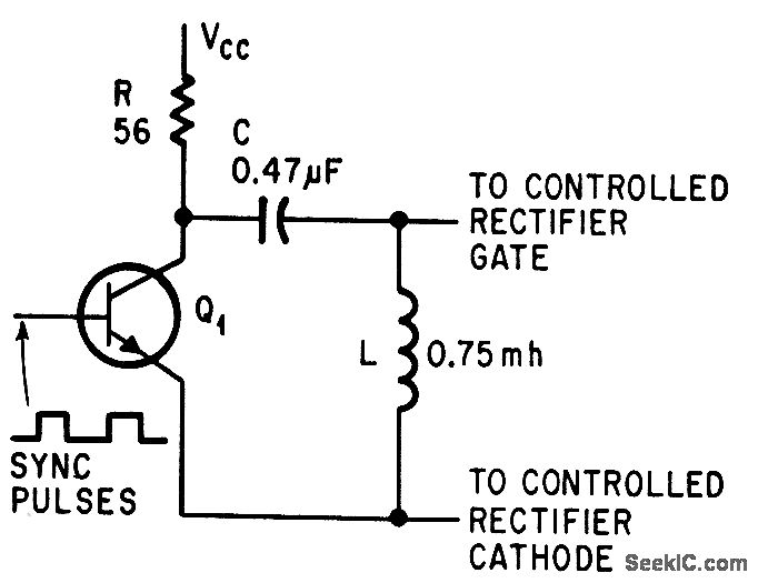 Sync pulses saturate driver Q1, permitting C to charge, for achieving fast turnoff after pate-turnoff scr conducts yoke current for 27 microsec to defect electron beams.-L. D. Shergalis, Scr's for 19-Inch Tv, Electronics, 37:23, p 97-98.