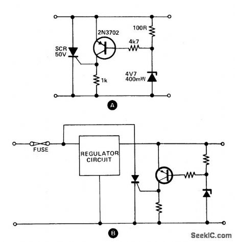 These circuits provide o,vervoltage protection in case of voltage regulator failure or application of an external voltage. Intended to be used with a supply offering some form of short circuit protection, either foldback, current limiting, or a simple fuse. The most likely application is a 5 V logic supply, since TTL is easily damaged by excess voltage. The values chosen in A are for a 5 V supply, although any supply up to about 25 V can be protected by simply choosing the appropriate zener diode. When the supply voltage exceeds the zener voltage +0.7 V, the transistor turns on and fires the thyristor. This shorts out the supply, and prevents the voltage rising any further. In the case of a supply with only fuse protection, it is better to connect the thyristor the regulator circuit when the crowbar operates. The thyristor should have a current rating about twice the expected short circuit current and a maximum voltage greater than the supply voltage. The circuit can be reset by either switching off the supply, or by breaking the thyristor circuit with a switch.