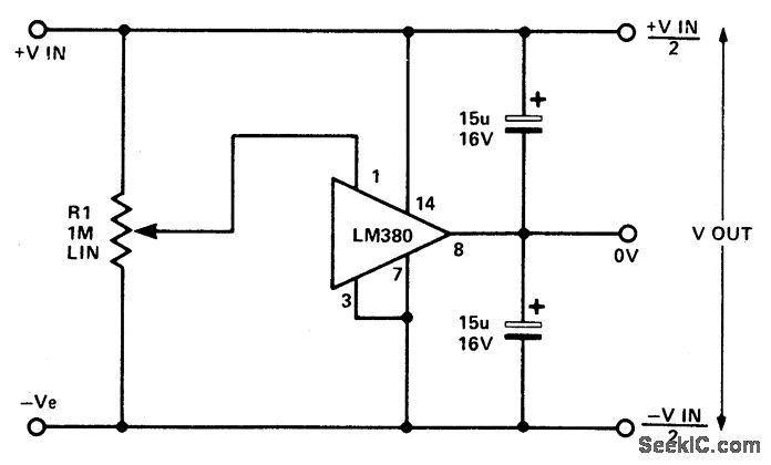This circuit utilizes the quasicomplementary output stage ofthe popular LM380 audio power IC. The device is internally biased so that with no input the output is held midway between the supply rails. R1, which should be initially set to mid-travel, is used to nullify any inbalance in the output.Regulation of Vout depends upon the circuit feeding the LM380, but positive and negative outputs will track accurately irrespective of input regulation and unbalanced loads. The free-air dissipation is a little over 1 watt, and so extra cooling may be required. The device is fully protected and will go into thermal shutdown if its rated dissipation is exceeded. Current limiting occurs if the output current exceeds 1.3 A. The input voltage should not exceed 20 V.