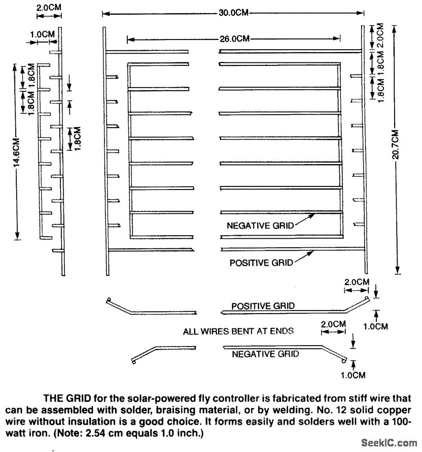 produced by the switching voltage across the relay's coil. The switching circuit is turned off at night or during periods of heavy cloud cover by phototransistor Q3, whose internal resistance increases as the ambient light diminishes. This reduces the positive bias on Q1's base, causing the transistor to cut off. LED1 serves as a voltage-dropping device. Single-pole, single-throw relay RY1 provides brief pulses of the 12-V battery voltage to IC3, an NE755 timer that is wired as a free-running audio-frequency pulse generator. The pulses are amplified by a 2N3055 power amplifier transistor, Q2.The output of Q2 drives an automobile ignition coil, T1, to generate the high-voltage pulses for the external grid. The output voltage at the secondary winding of T1 is approximately 12,000Vp-p. The circuit is powered by a 12-V rechargeable lead-acid or nickel-cadmium battery. A 1-W or better solar panel of the type used to keep automobile batteries charged should be used to eliminate the need to recharge the battery frequently.