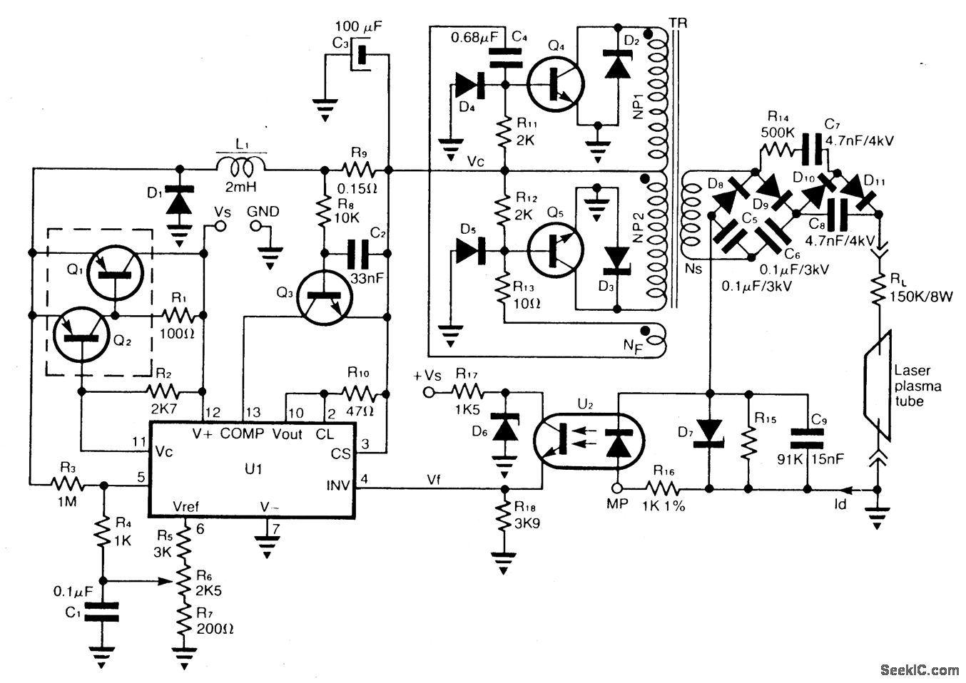 The circuit uses a free-running push-pull dc to dc high voltage converter to get the necessary voltage for the laser plasma tube supply. The supply voltage VC of this converter, is adjusted by a switch-mode power supply in order to keep the load current constant, at set value. The linear opto-electronic isolator U2, connected in series with the laser plasma tube, gives a voltage VF proportional to the discharge current ID across R18, having the correct polarity to drive directly the inverting input of U1, D7, R15 protects the optoisolator diode against damage produced by the high voltage ignition pulse.Due to the high operating frequency of the high voltage converter (25 kHz) the ripple of the laser output power is less than 2.10-4. The stability of ID is better than 10-2, for variations of supply voltage VS is the range of ±10%, and depends on the optoisolator sensitivity.