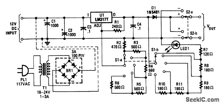 Intended as a replacement for generally poorly regulated wall-type ac/dc adapters, this circuit offers superior performance to simple, unregulated adapters. Voltages of 3, 6, 9, and 12 V are available. The DPDT switch serves as a polarity-reversal switch. R2 through R6 can be replaced with a 2.5-kΩ pot for a variable voltage of 1 to 12 V. R7 through R10 can be replaced by a fixed resistor of about 1 kΩ if the LED1 brightness variation with output voltage is not a problem.