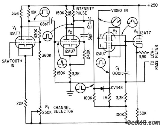 Constant-amplitude sawtooth from timebase of display unit is fed to one control grid of Schmitt trigger V1, whose output triggers one-shot mvbr to produce gating pulse 0.1 millisec wide that also identifies strobed channel on crt by brightening trace c-d that point.-A. Potton, Telemetry System for Testing Automobiles,Electronics, 33:43, p 57-59.