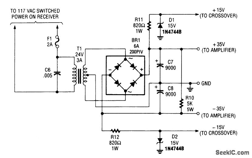 Although intended to power a 100-W low-frequency amplifier, this power supply should handle many mono or stereo amplifiers in the medium power range that require ±30 to 35 V.