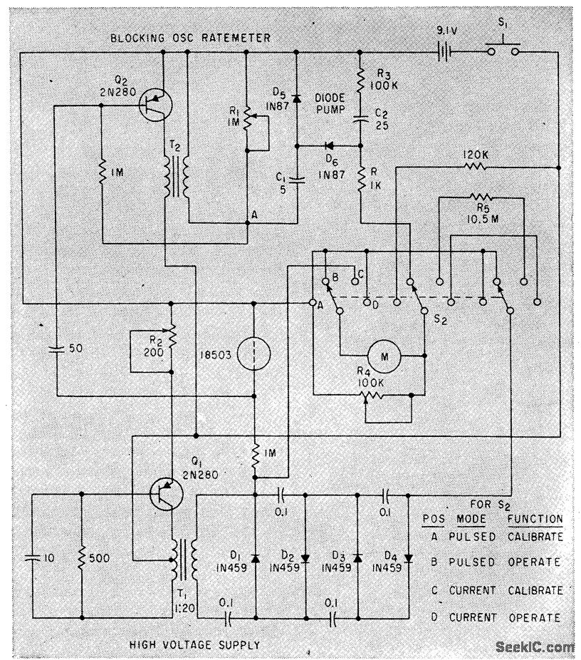 High-voltage source for G-M counter uses 10-kc blocking oscillator and Cockcroft-Walton multiplier, to give 550 v stabilized by zener region of D1. Range for pulsed operation is 0.5 to 50 milliroentgen per hour. For current mode, same 18503 G-M tube is used, and current in range of 50 milliroentgen to 5 roentgen per hour is logarithmic function of radiation intensity.-R. W. Lehnert and J. M. McKenzie, Radiation Survey Meter, Electronics, 35:8, p 50.