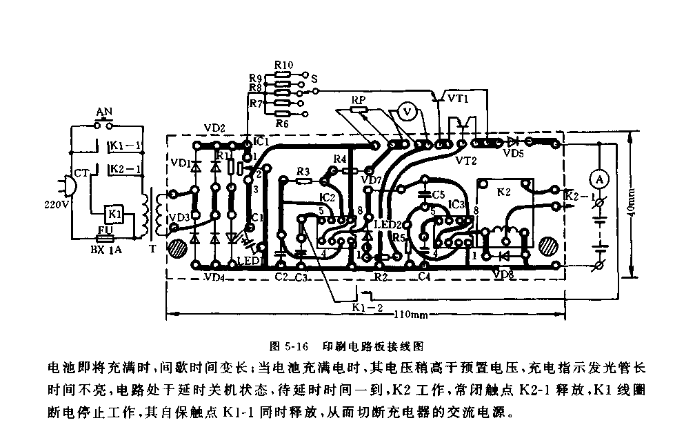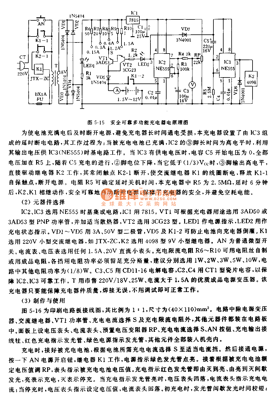 The principle diagram of this charger is as shown in figure 5-16. The 220V city electricity is reduced by the transformer T, and it is bridge rectified by the diodes VD1-VD4 to output the 17V, 100Hz pulsating DC voltage, this DC voltage can supply the power to the charging circuit. The DC current is stabilized by IC1 to supply power to the time-base integrated circuit IC2(NE555), so the IC2(NE555) produces the oscillation, we can use the pulse signal which is output by the pin-3 to control the conduction and cut-off of the darlington tube which is composed of the VT1 and VT2. This circuit has the RP, the electric potential of the adjustable port of it can be used to set the recharging the battery benchmark voltage.