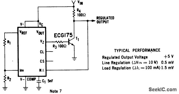 Shunt regulator(+5 volts)using an ECG915 or ECG915D.For a ±5% fixed output resistor R1 is 2.15 ohms and R2 is 4.99 ohms,For metal can applications where Vz is required,a 6.2-volt zener should be connected in series with the regulated output(courtesy GTE Sylvania Incorporated).