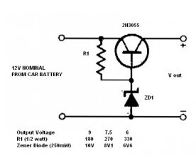 This DC to DC converter circuit enables transistorized items such as radio, cassettes, and other electrical devices to be operated from a car’s electrical supply. The table gives values for resistors and specified diode types for different voltage. Should more than one voltage be required a switching arrangement could be incorporated. For high currents, the transistor should be mounted on a heatsink.