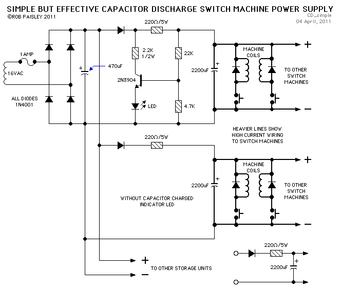 To increase the availability of switch machine power more than one discharge unit can be connected to a central transformer and rectifier / filter capacitor. This would allow smaller discharge units to be placed around the layout and used to operate machines that are nearby.