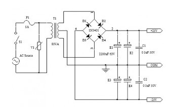The diagram above shows how the DC +25 V and-25V DC can be obtained. Ready to provide power to two stereo amplifiers, one 80VA transformer with 240V input and 36V output, with the center tap is used. The output of the transformer secondary repaired using four 1N5401 diodes and filtered through four electrolytic capacitors. A fuse and a varistor connected to the main circuit protection against voltage spikes.