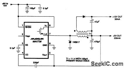 In this circuit, a MAX738 provides a +5-V 200-mA output through the inductor primary, and a + 12-V 30-mA output through the inductor secondary for inputs from 8 to 15 V .