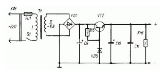 The power supply is designed to supply a stabilized 5V various digital devices with current consumption up to 0.5 A. The transformer T1 is made on the magnetic core SHL20H32.The network contains 1650 turns of PEV-1 d = 0,1 mm, coil II – 55 turns of PEV-1 d = 0,47.In general, for the power supply can use a suitable transformer ready 7W, which provides for winding II AC 8 … 10 V at a current of 500 mA.Regulating transistor VT2 is mounted on the L-shaped dural plate 50×50 and 2 mm thick.