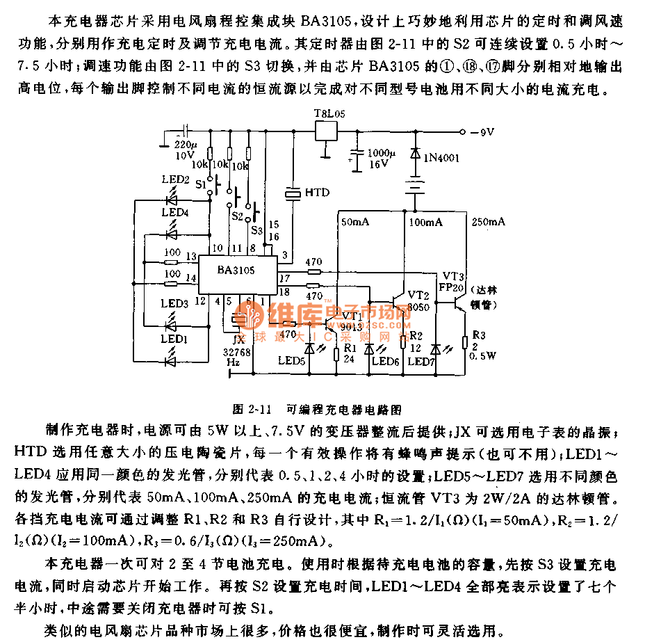 This charger uses the electric fan program control manifold block BA3105, it masterly uses the timing and wind speed regulating function of the chip, and the current can be used as the charging timing current and the adjustment charging current. The timer can be set to 0.5-7.5 hours by the S2 which is as shown in figure 2-11; the speed adjustment function is switched by S3 of the figure 2-11, and the pin-1, pin-18 and pin-17 relatively output the high level respectively, every output pin controls different constant current source.
