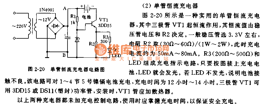 The practical single-tube constant current charger is as shown in figure 2-20, the transistor VT1 has the function of constant current, the constant current value is decided by the voltage of the regulator tube and R2, the voltage regulator tube uses the 3.3V regulator tube, the resistance R2 is (30Ω-60Ω)/(1W-2W), at this time the charging current is about 50mA-80mA. The charging indicator circuit is composed of the R3(200Ω-500Ω) and LED, as long as you connect the rechargeable batteries to the circuit, the LED will turns on. If the LEd will not turn on, the battery is bad. This circuit can charge one to four Number five nickel cadmium batteries, the charging time is 12-14 hours. The transistor VT1 can use the 3DD15 or DS11 power tube.