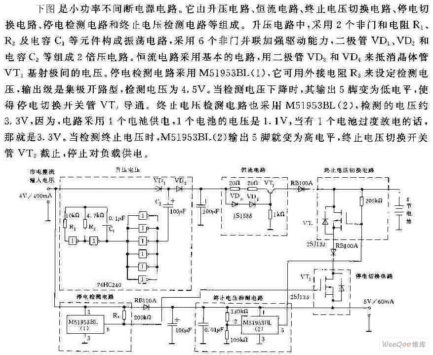The above picture is a small power uninterrupted power supply circuit.It consists of lift circuit, constant current circuit, terminate circuit, switching circuit, power switching circuit, power switching circuit, power detection circuit and termination voltage detection circuit etc.In the lift circuit,the two longest-serving outfield and resistance R2, R1and capacitance C1 constitute oscillating circuit and it uses six longest-serving outfield in parallel way to strengthen the drive ability.Diode VD1 and VD2 and capacitance C2 constitute 2 times voltage circuit.Constant current circuit uses basic circuit, diode VD3 and VD4 to offset voltage between the transistor VT1 and basic emitting.The blackout detection circuit, M5193BL (1) can use set the external resistance,R3 to set detecting voltage and the output is a very open type, detection set voltage is 4.5 V.